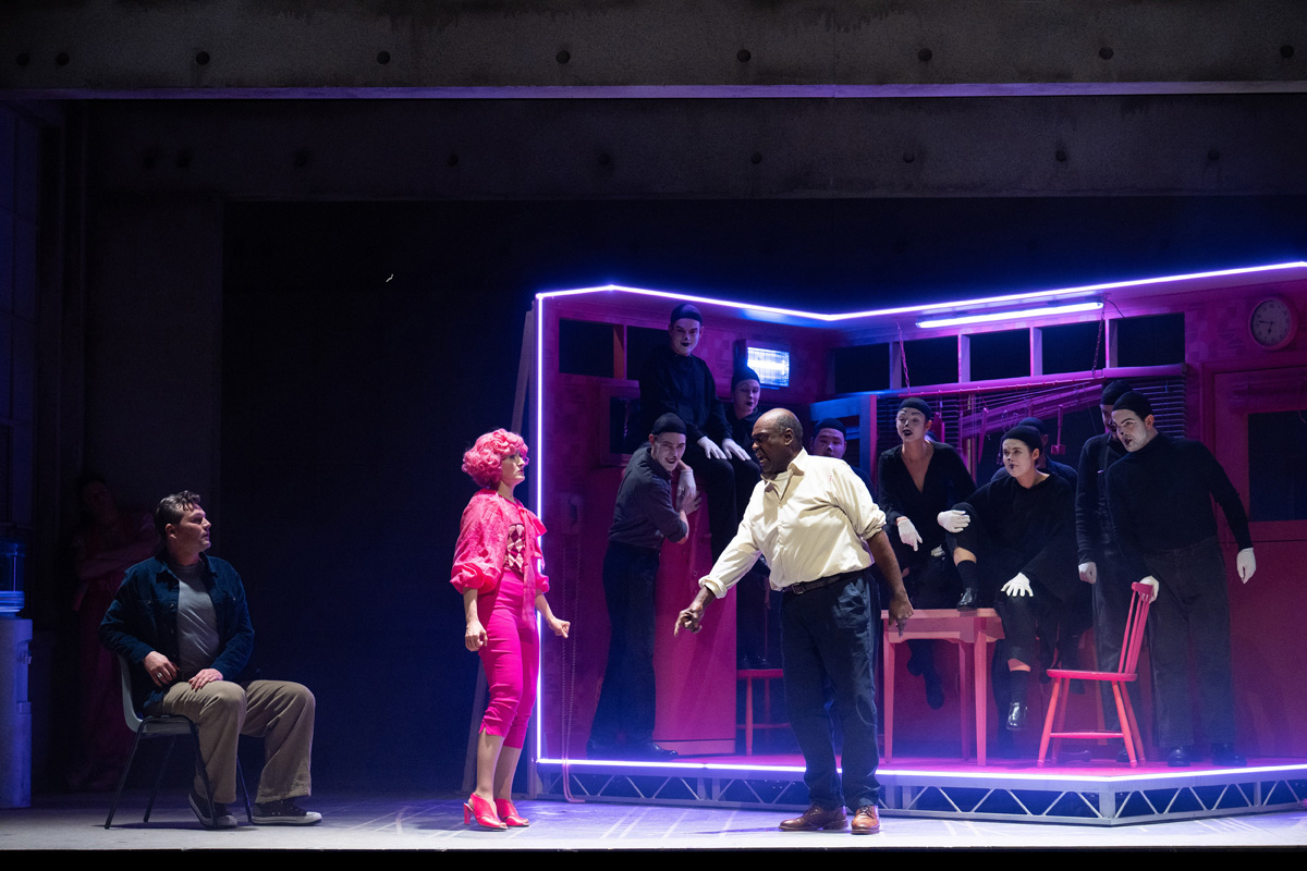 Now, for the atmosphere. The set designer, Michael Pavelka, bounces between basicness and extravagancy, creating the perfect contrast for the audience to follow. The lights, particularly in Act 2, were extremely bright, creating an overdramatic outlook on the fake performance performed; however, this should definitely be something to consider if you are sensitive to that. With the first half being designed with simply a couple of doors, water coolers, and chairs, the audience is focused primarily on the actors (particularly Nedda and Canio in their expensive coats), while in the second act, they all blend into one beautiful pink, screaming for the audience to enjoy the over-the-top show. It does not overpower, nor distract, but rather it creates the full image that we as an audience need for the performance to make sense.