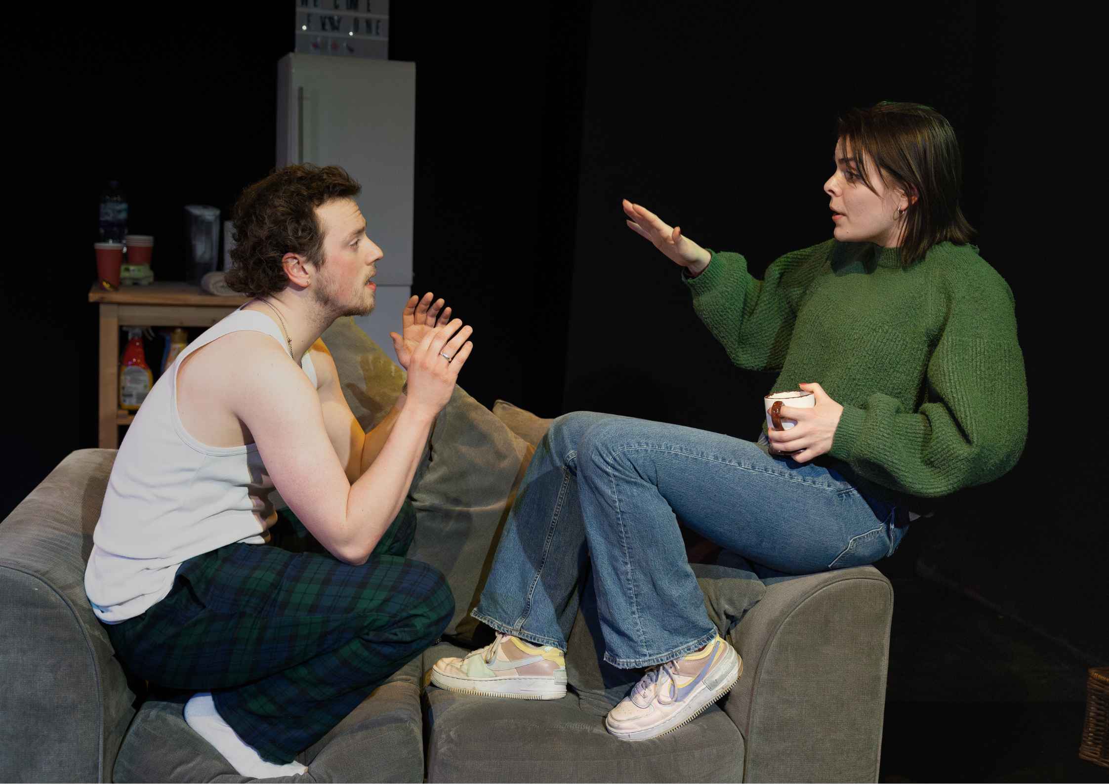 The lights come up on an unimpressive domestic interior: a sofa, table, fridge and signs saying ‘Welcome Everyone’ and ‘Good Vibes Only’ – clearly a portent of doom. This is the living room of a five-student house share at the beginning of term.